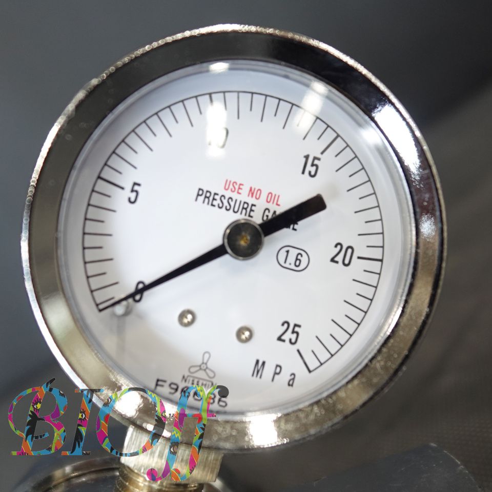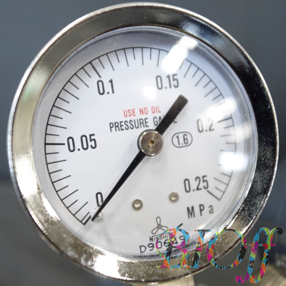 仕 様 | ・使用可能ガス:CO2(炭酸)、CO2+N2 ・使用可能流量:微量 ・ガス入口、出口:ボンベへの取付口 W22-14(右)袋ナット パッキン当り 出口形状 Φ6mmホース口 取り外すとM16×P1.0右オスR当り ・圧力計:一次側圧力計 25MPa計 二次側圧力計 0.25MPa計 |