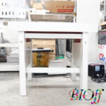 松下車両産業製のボンベスタンドです。鋼材を使用した床置きタイプで、底板にはボンベ底を安定して受ける円形のくぼみが設けられています。支柱上部と中段にボンベを保持するリングがあり、チェーンでボンベ胴部を固定する構造のため、ガスボンベなどの転倒防止に有効です。ベースプレート四隅にはアンカー固定用とみられる穴があり、床面へ据付けて使用できます。型番や容量表示は外観から確認できませんが、一般的な工場や研究施設などでの高圧ガスボンベ保管・一時置き用途に適した汎用的なスタンドです。中古品のため塗装の摩耗やキズ等が見られる可能性があります。