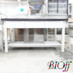 島津製の大型実験台です。天板1枚と脚部2分割で構成されており、現場への搬入やレイアウト変更がしやすい構造となっています。天板は黒色で大型分析装置や測定器などの設置を想定した堅牢な仕様とみられ、脚部はホワイトカラーのパネルで周囲の機器と調和しやすいデザインです。研究室や分析室などで広い作業スペースが必要な用途に適しています。